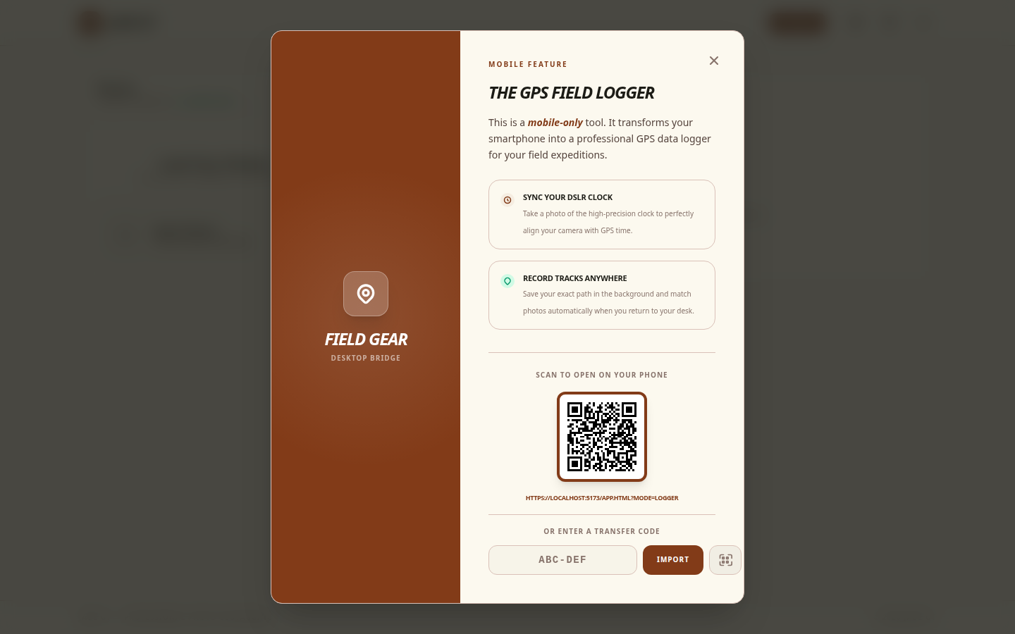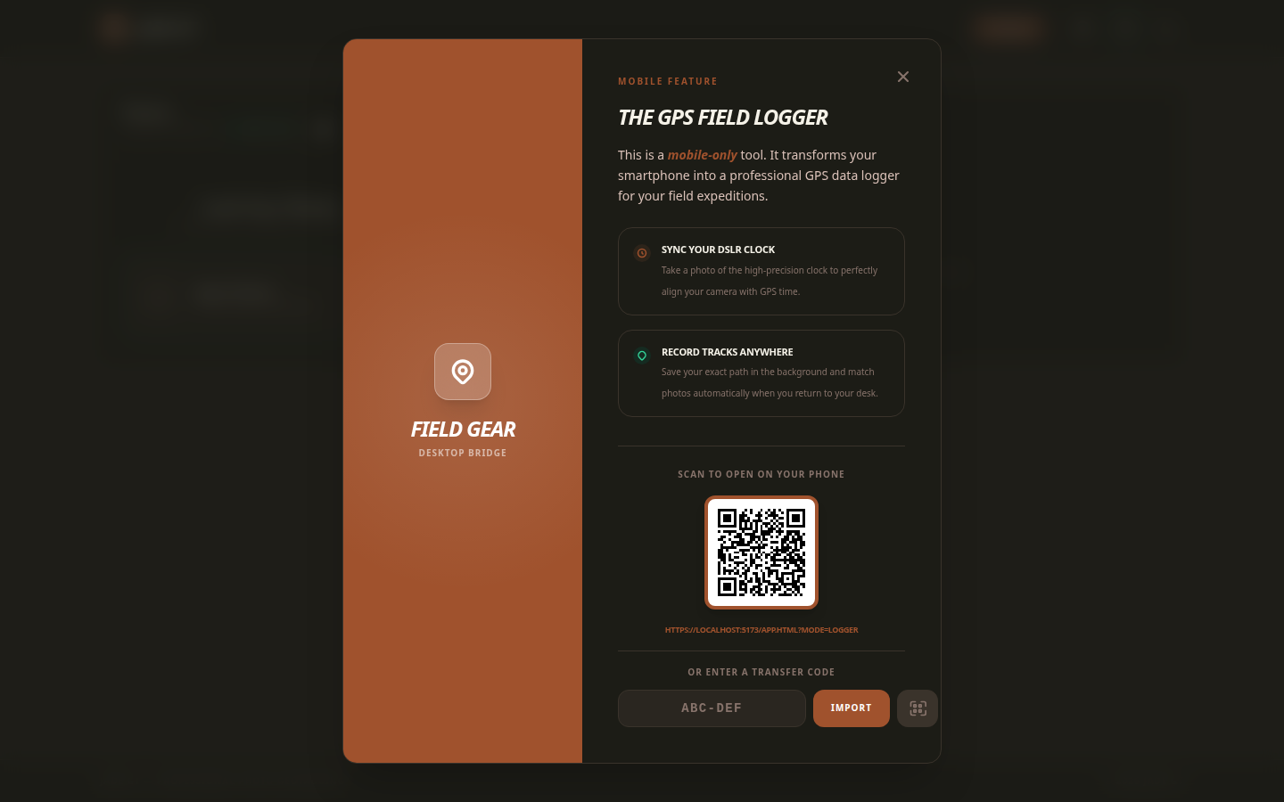 - Bridge transfer: back at your desk, open the Bridge modal (header → Mobile GPS Logger), enter the transfer code your phone shows, and click Import. The