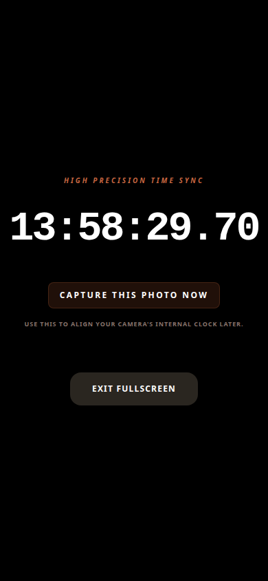 The fullscreen UTC clock: a photographable reference frame, not a feature that auto-detects the photo later. -
